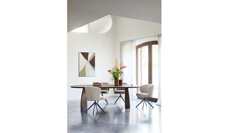 Armstoel Mandolia is met zijn trendy afgeronde vorm een echte eye-catcher voor aan je eettafel. Deze moderne eetkamerstoel is uitgevoerd in een mooie taupe kleurige weefstof en een draaibaar zwart metalen onderstel inclusief terugdraaimechanisme. Hierdoor zal de stoel altijd weer naar zijn oorspronkelijke positie terugdraaien.