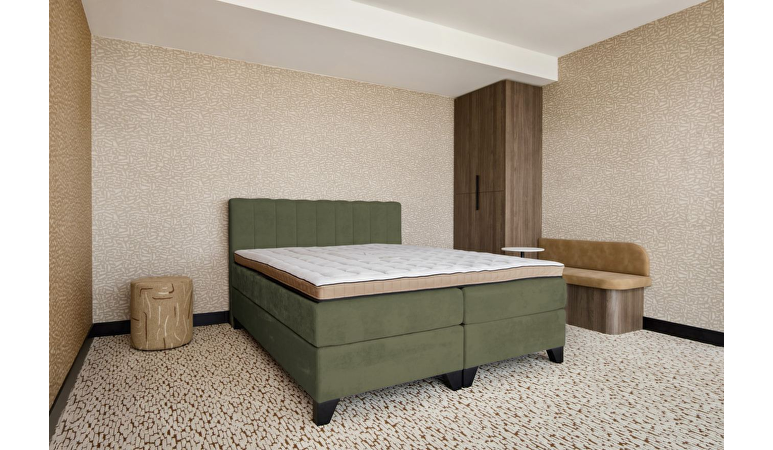 De Valk Exclusief x M line Hotelboxspring Suite met Luxury topper biedt een sublieme slaapervaring en brengt de luxe van een hotelsuite naar je eigen slaapkamer. Ontwikkeld volgens de hoogste hotelstandaarden combineert deze boxspring geavanceerde M line slaaptechnologie met een verfijnd en stijlvol design. Het rijk gestoffeerde hoofdbord met verticale belijning geeft de slaapkamer een elegante en luxueuze uitstraling.