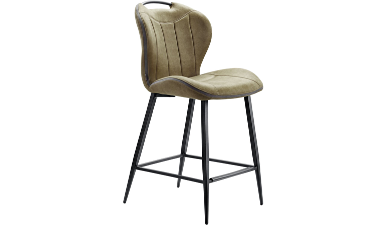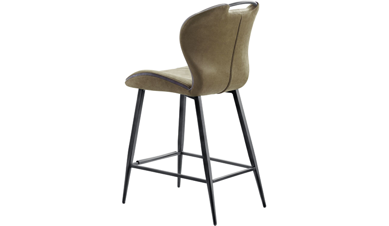 Barkruk Tantini heeft een stoere uitstraling door de groene kleur met bruine ondertoon. Dit is een microvezelstof die eruitziet als leder, maar heerlijk zacht aanvoelt. Het retrostiksel op de rug en zitting, en de band in een grijze stof accenturen de stoere belijning van deze barkruk.