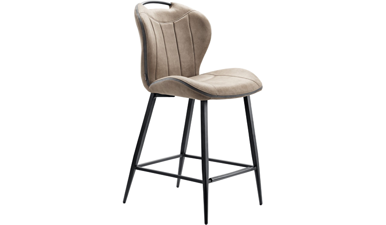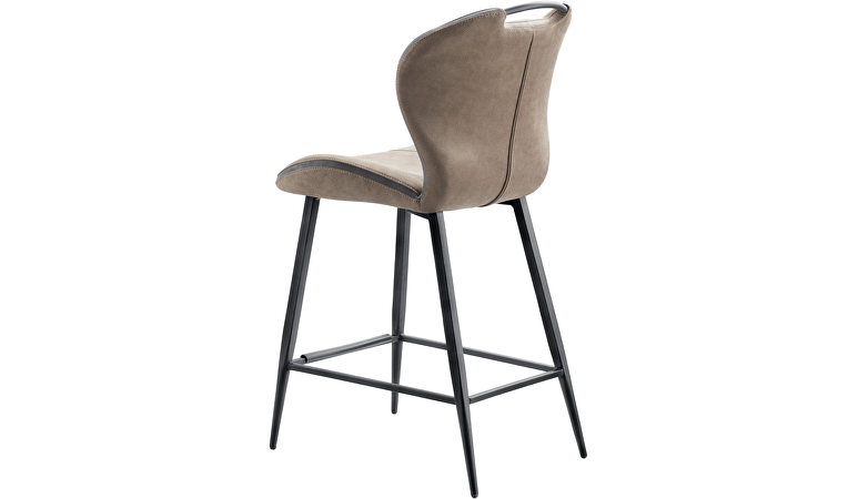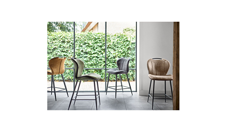 Barkruk Tantini heeft een stoere uitstraling door de lichtbruine kleur. Dit is een microvezelstof die eruitzie als leder, maar heerlijk zacht aanvoelt. Het retrostiksel op de rug en zitting, en de band in en grijze stof accenturen de stoere belijning van deze barkruk.