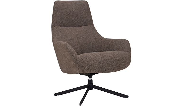 Deze elegante fauteuil is uitgevoerd in een bruin-grijze bouclé stof bestaande uit los geweven patronen, draden en lussen. Ondanks de onregelmatige structuur die hierdoor ontstaat, is deze stof heerlijk zacht en geeft het een warme uitstraling.