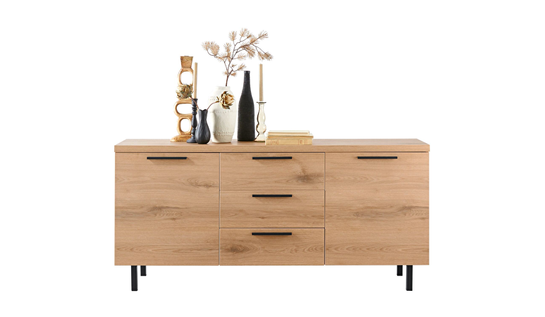 Met een hoogte van 77 cm, breedte van 165 cm en diepte van 42 cm biedt dit dressoir met twee deuren en drie laden genoeg ruimte voor persoonlijke spullen en accessoires. De softclose-functie zorgt ervoor dat de deuren en laden soepel en geruisloos sluiten. Het meubel wordt grotendeels gemonteerd geleverd; alleen een kleine montage, zoals het bevestigen van de handgrepen, is nog nodig.