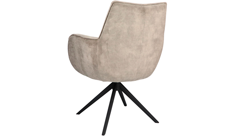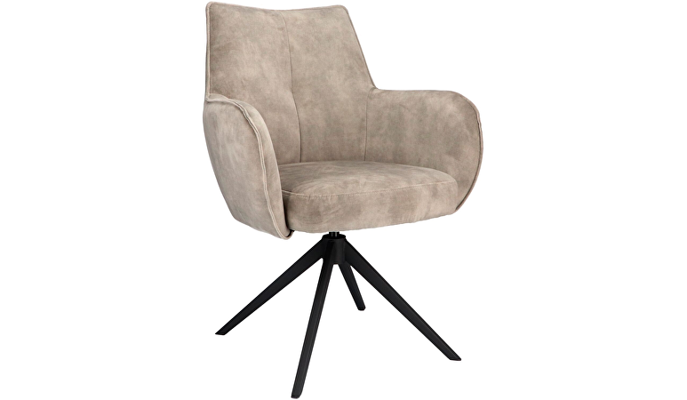 De armstoel Dordona is een comfortabele en moderne toevoeging aan de eetkamer. De stoel is uitgevoerd in een zachte velvetstof in een grijs-beige tint. Deze stof voelt fluweelzacht aan, heeft een luxe uitstraling en is tegelijk slijtvast en onderhoudsvriendelijk. De afgeronde armleuningen en de zwarte metalen draaipoot geven de Dordona een eigentijdse look. Dankzij de prettig gevormde kuip en de vaste kussens in rug en zitting biedt de stoel optimaal zitcomfort, ook tijdens lange avonden aan tafel.