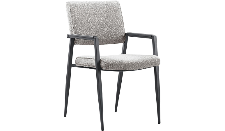 Stoel Jisca is uitgevoerd in stof touch in de kleur rhino. Stof touch is een geweven boucléstof en voelt zacht aan. De combinatie van de zachte stof en het zwart metalen frame, dat met strakke lijnen doorloopt in de armleuningen, geven de stoel een moderne uitstraling. De armleuningen zijn voorzien van zwart kunststof voor extra armcomfort.