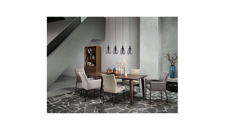 Sessione is een ranke eetkamerstoel met armleuningen met een elegante uitstraling. De stoel is bekleed met een donkergrijze gemêleerde weefstof. Deze licht meerkleurige kwaliteit heeft een wat grovere structuur, maar wel een erg zachte touch. Op de achterzijde van de rugleuning zit een ritssluiting in dezelfde kleur als de stof.