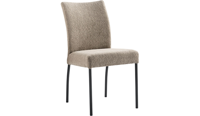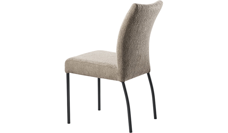 Sessione is een ranke eetkamerstoel met een elegante uitstraling. De stoel is bekleed met een beige-grijs-groene teddystof die ontzettend zacht aanvoelt.