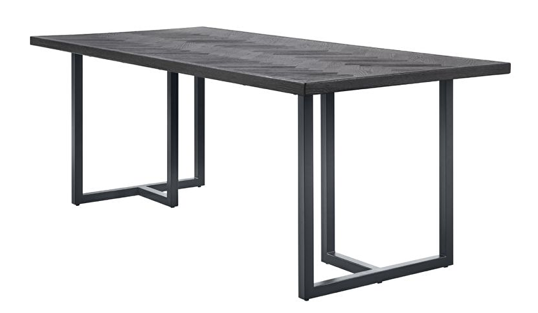 Zwarte eetkamertafel met zwarte metalen T-poten van 4x4 cm uitgevoerd in eiken fineer met visgraat motief. De afmetingen zijn H78xB95xL190cm. Deze stoere eetkamertafel geeft een industriële look binnen je interieur. De hoogte vanaf de grond tot de onderkant is ongeveer 73cm. De ruimte tussen de poten aan de lange zijde is ca 166cm. De eetkamertafel is ook beschikbaar in andere maten (160cm of 220cm) of met U-poten. Het blad kan daarnaast ook met een naturel blad geleverd worden. Je dient enkel de poten nog eventjes te monteren.