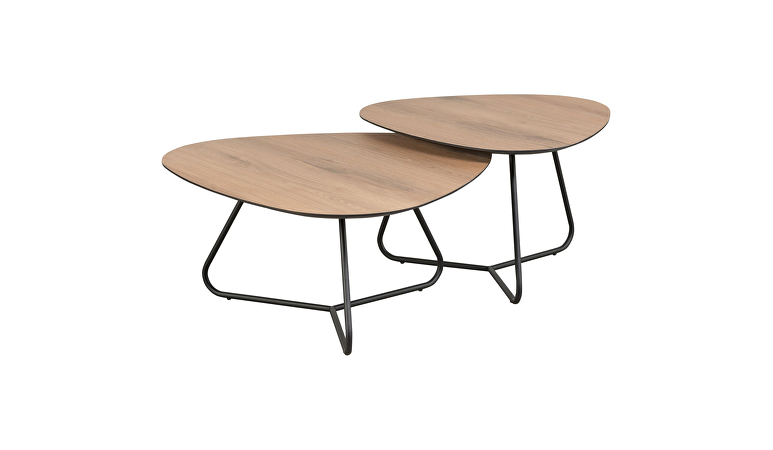 De bladen zijn driehoekig van vorm, wat de set een speelse en eigentijdse uitstraling geeft. Het zwart metalen onderstel vormt een mooi contrast met het warme blad. De twee tafels zijn los van elkaar te plaatsen, waardoor je ze flexibel kunt gebruiken: samen als salontafelset of apart als bijzettafel naast de bank of fauteuil. De set wordt ongemonteerd geleverd, maar met de bijgesloten handleiding zet je de tafels eenvoudig in elkaar.