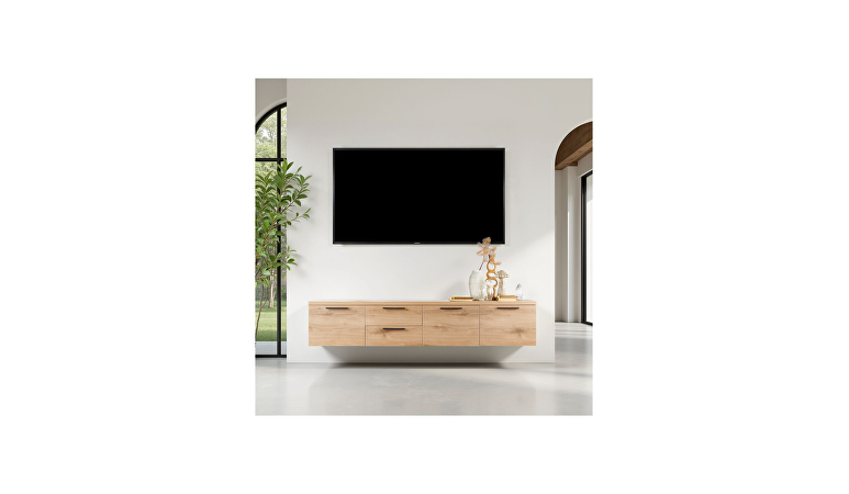 Dit tv-meubel kan zowel hangend als staand geplaatst worden. Plaats je het meubel op pootjes, dan is de hoogte 43 cm. Hang je het meubel op, dan is de ideale hoogte 57 cm. Met een breedte van 220 cm en een diepte van 42 cm is dit royale tv-meubel voorzien van drie deuren en 2 laden. Alle deuren en laden zijn voorzien van softclose, waardoor ze soepel en geruisloos sluiten. In het open vak plaats je eenvoudig je apparatuur, terwijl in de laden ruimte is om mediatoebehoren of accessoires netjes uit het zicht te bewaren. Achter de deuren bevindt zich een legplank voor extra opbergruimte. Aan de achterzijde bevindt zich een opening om kabels netjes weg te werken. Het meubel wordt grotendeels gemonteerd geleverd; alleen een kleine montage, zoals het bevestigen van de handgrepen, is nog nodig.
