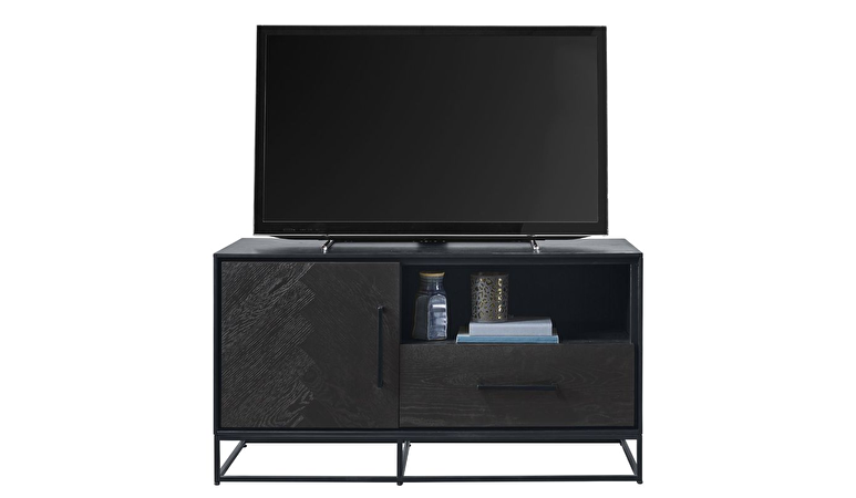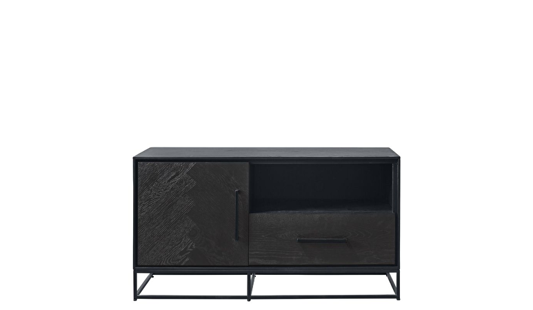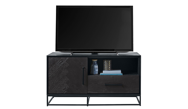 Zwart eiken TV-Meubel met zwarte romp en zwarte metalen poten. Het beschikt over 1 deur met visgraat motief, 1 lade (met soft-close systeem) en 1 open vak. Het open vak is H21xB60xD38 groot en is al voorzien van een ronde opening voor de kabeldoorvoer. De totale afmetingen zijn H58xB109xD40cm. Het TV-Meubel wordt gemonteerd geleverd en is daarnaast leverbaar in grotere maten of in de kleur naturel.