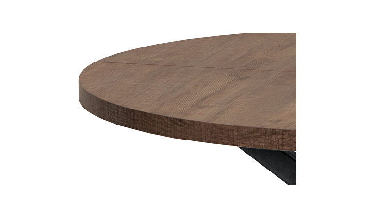 Met een doorsnede van 140 cm is deze ronde tafel ideaal voor kleinere kamers. De tafel is uitgevoerd in de kleur Dark Mango en heeft een melamine blad met een strakke zwarte randafwerking, wat zorgt voor een moderne en luxe look. De zwarte metalen spinpoot geeft de tafel een robuust karakter en biedt veel beenruimte. De tafel is uitschuifbaar tot 180 cm en krijgt dan een ovale vorm. Bij gebruik van smalle stoelen zonder arm kunnen er dan tot 6 personen aan tafel of 4 eetkamerstoelen met arm. De onderregel op ca. 73 cm hoogte zorgt ervoor dat de meeste eetkamerstoelen er moeiteloos onder passen.