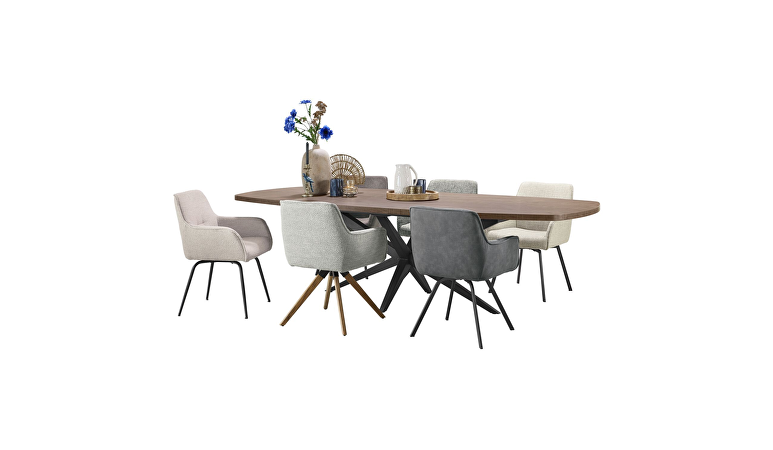 De Mascaro eettafel voegt een stijlvol accent toe aan jouw woonruimte. Het strakke ontwerp en de natuurlijke houtlook zorgen voor een warme sfeer, terwijl de stevige constructie garant staat voor jarenlang gebruik. De Deens ovale vorm van het blad zorgt voor een moderne uitstraling, terwijl de zwart metalen spinpoot een stoer karakter toevoegt. Met een lengte van 200 cm, breedte van 102 cm en hoogte van 77 cm is deze tafel perfect voor elke woonkamer. Bovendien is het blad uitgerust met een handige uitschuiffunctie, waardoor je eenvoudig extra ruimte creëert voor vrienden en familie… tot wel 260 cm lengte! Een ideale keuze voor zowel gezellige avonden als elegante diners.
