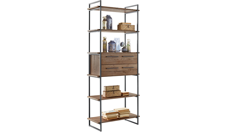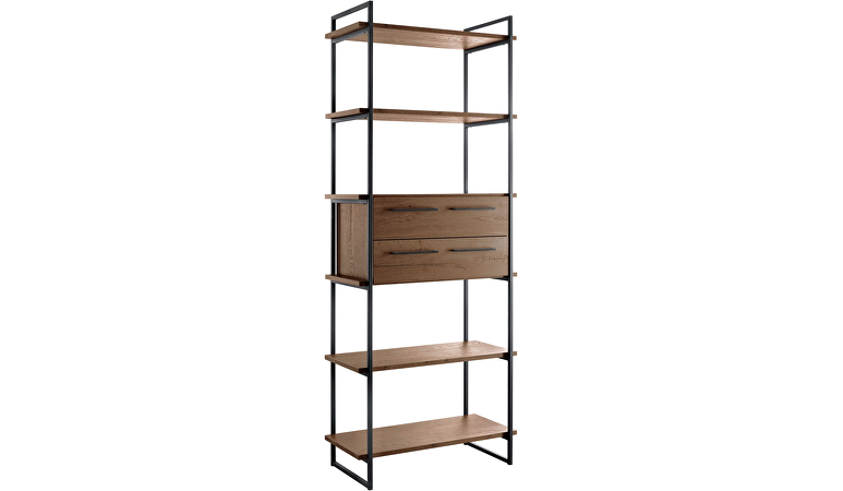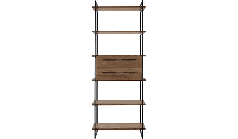 Deze kast combineert een strak zwart metalen frame met warme accenten in de kleur dark mango, een houtdecor met een diepe, levendige houttekening die sfeer en karakter toevoegt aan je interieur. De set bestaat uit twee zwarte metalen staanders, zes legplanken van 88 cm breed en een inzetkast met twee lades. Afmeting: H226 x B88 x D45 cm. Je zet de kast eenvoudig zelf in elkaar. Alle onderdelen zitten overzichtelijk in één pakket met een duidelijke montagehandleiding. De inzetkast is al voorgemonteerd.