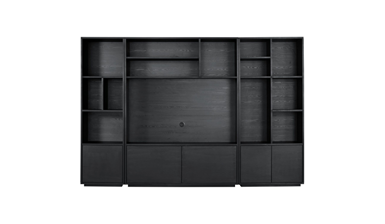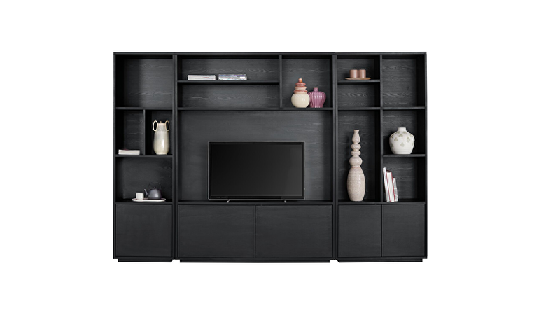 TV-kastenwand Hatonia is onderdeel van een meubelserie met een moderne en tijdloze uitstraling. Deze complete TV-wall bestaat uit een hoge wandkast van 60 cm met 1 deur, een grote tv-wandkast van 154 cm breed met 2 deuren en een wandkast van 90 cm breed met 2 deuren. Dankzij de hoogwaardige Lamulux afwerking in Noir, heeft Hatonia de uitstraling en het gevoel van echt hout, maar is zeer kras-, slijt- en stootvast en makkelijk in onderhoud. Alle deuren zijn voorzien van een soft-close en push-to-open systeem.
